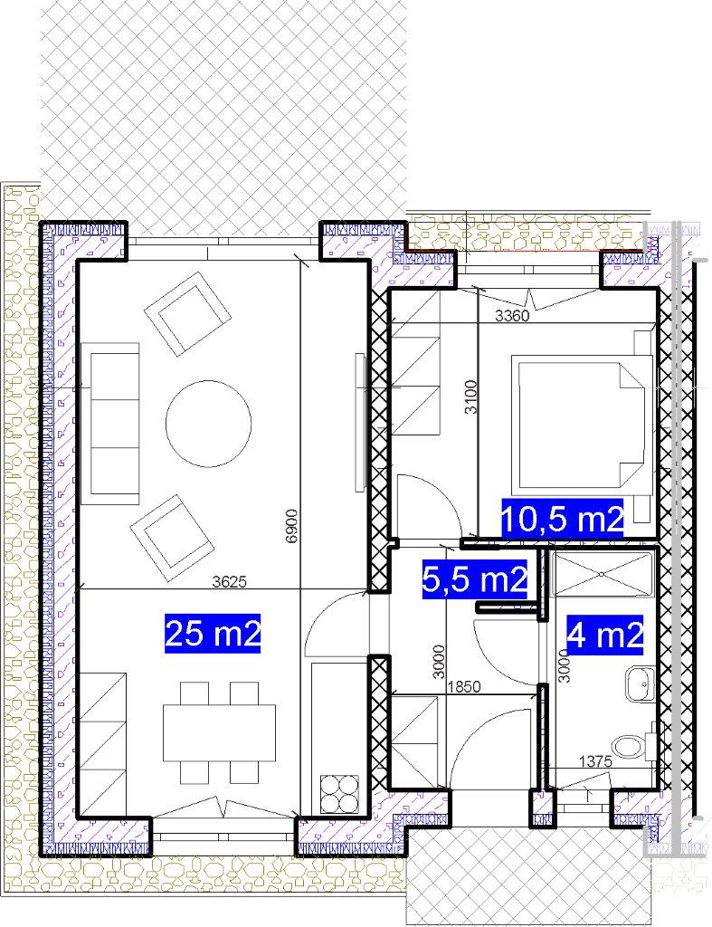 Při vstupu do domu se po pravé straně nalézá koupelna, rovně je ložnice a po levé straně je kuchyně s obývacím pokojem. Každý dům má terasu a k ní i záhrádku. Internet a televizní signál je od poskytovatele AC Vyškov.